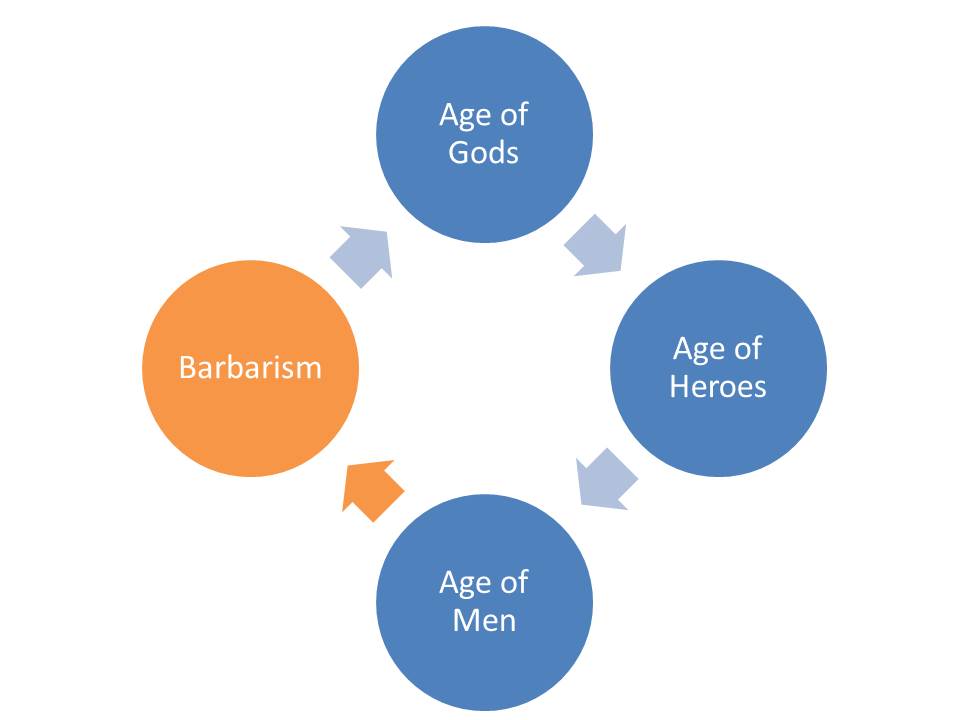 The study of Western World History in high school usually starts with ancient Greece and Rome. The cycles of these two civilizations have been studied by Vico, so here we will start our examination with the transition in Ancient Greece from Age of Men to Barbarism, which is indicated in orange in the diagram below.