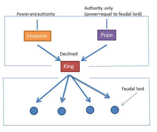 Here, let's look at the relation between Emperor, who was the ruler in the secular realm, and Pope, who was the ruler in the spiritual realm. Initially, there was a symbiotic relationship between the two, because Pope needed protection and Emperor wanted legitimacy, by acquiring the recognition by Pope, to be the true emperor among many contenders. In 800, Pope Leo III crowned Emperor Charlemagne as the West Roman emperor. However, their relationship gradually became more competing over power. The diagram below shows this relationship.