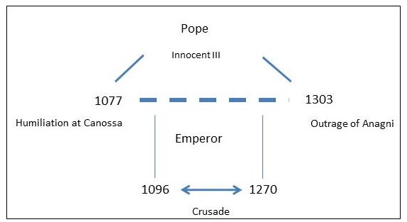 According to this diagram, Pope enjoyed his superior position between the Humiliation at Canossa in 1077, in which an emperor was excommunicated by Gregory VII and the Outrage of Anagni in 1303, in which a pope died in the fight with French king, Phillip IV. Between 1096 and 1270, under the papal leadership, they conducted Crusades. However, the empire gradually declined and new challengers for the secular power emerged. They became centralized states. These are the political units that exist today, such as Great Britain, France and Spain. Their processes of centralization were different, which we do not get into at this time. The overall trend is summarized in the diagram below.