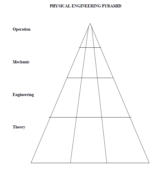In order to understand the field of metaphysical engineering, first, we will start with looking at the field of physical engineering. This field is made up of a pyramid which mainly consists of three subdivisions: mechanical engineering, electrical engineering and chemical engineering. The pyramid also consists of four layers: theory, engineering, mechanics, and operations. It is shown in the diagram below. Please click.