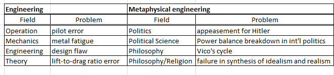 When we find problems, it is important to deal with them at the suitable layer. The same thing applies to metaphysical engineering. Here, let's compare the two fields, using the examples of an airplane crush and World War II. Let's look at the table below.