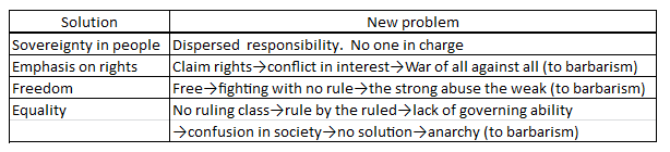 The problems in democracy are to disperse sovereignty too much, and to place too much emphasis on the notions of rights, freedom and equality. This is a reaction to the polar opposite regime, but if democratic decay deepens, as a reaction to this regime, polar opposite solutions may be presented - namely - to give concentrated power to one individual, who would govern and give orders to his or her people to follow blindly. There, freedom would be viewed as hindering to maintain order in society, and, therefore, be eliminated. This would start another cycle of Vico.