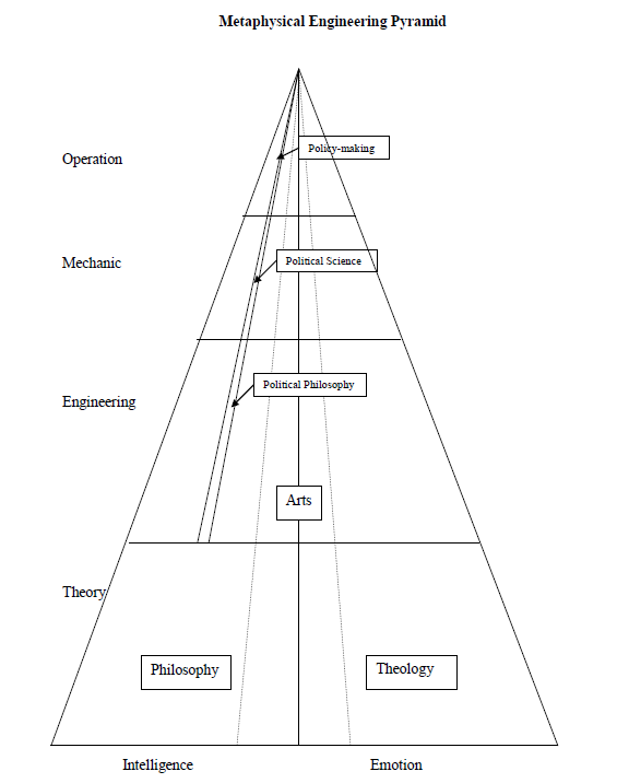 As in the field of physical engineering, there must be close communication and constant feedback between these subdivisions and layers. So, it is necessary to integrate all the currently separated fields. Philosophers must work with theologians and develop theories to integrate human intelligence and emotion. Based on these theories, scholars in the fields divided in sociology, anthropology, political science, economics and others must cooperate to design realistic social systems. Once these systems are developed, politicians are to apply them to each situation adequately. Then, just as the results of physical experiments must be accurately recorded, these historical events must be recorded by historians with the least possible prejudice. If results are not what was intended, these events should be closely analyzed to find out what went wrong, and then common elements among individual events must be found in the field of political science and other academic branches. Taking these common elements, philosophers will derive and explain fundamental principles. Once fundamental principles are revealed, they will be sent back up, where actual political systems are designed based on these principles. In these systems, politicians will execute actual policies. This circular process in the metaphysical engineering pyramid will repeat.