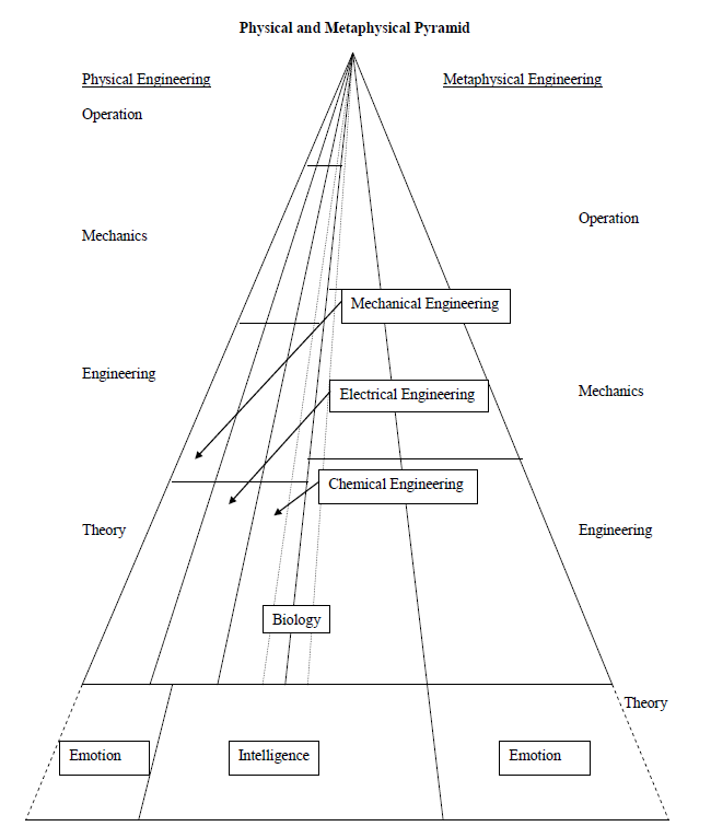 Now, in order for metaphysical engineering to be complete, it cannot be independent of physical engineering. Therefore, these two must be incorporated. In order to conduct projects in physical engineering, first we must set the goal. Do we want to develop a weapon for mass destruction, using quantum physics, or to develop a global communication system? This decision should be made in the field of metaphysical engineering. Therefore, the pyramid of physical engineering is to be incorporated into metaphysical engineering in the manner shown in the diagram below. Please click.