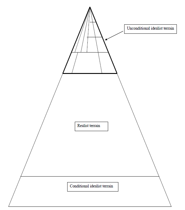 Finally, the field cannot be isolated from society. The whole field should fit in where idealist pyramid presented in Lecture 5 are located. This pyramid is to be incorporated into the unconditional idealist realm, which is shown in the diagram below. Please click. When this pyramid is finally completed, humanity will have conquered the historical cycle to live in stable society without the fear of tragic armed conflicts.